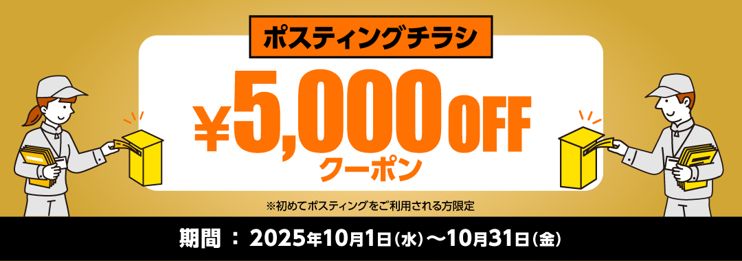 ポスティングチラシ サービスの印刷+配布料金が5,000円OFFでご注文いただける割引クーポンを進呈中です!