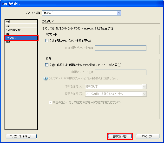 何も選択されていないことを確認し、「書き出し」ボタンを押すとPDFが作成されます。