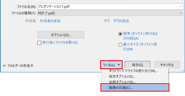 〈PDF のオプション〉の「PD/A 準拠」のチェックを外します。